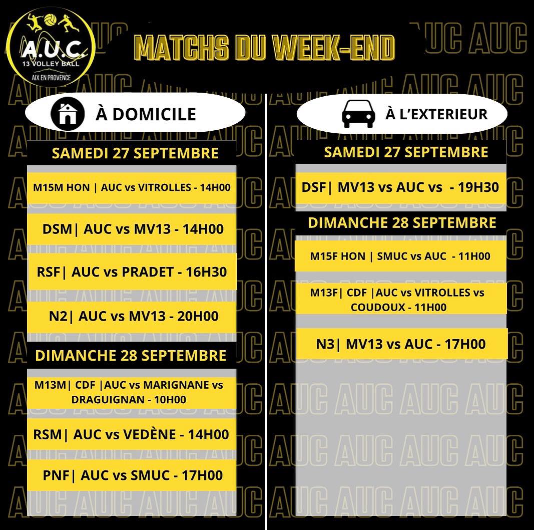 Peut être une image de texte qui dit ’女のべ A.U.C. 13VOLLEY BALL ENPRDUENCE MATCHS DU WEEK-END À DOMICILE SAMEDI 27 SEPTEMBRE M15M HON À L'EXTERIEUR AUC vs VITROLLES- 14H00 SAMEDI 27 SEPTEMBRE DSM| AUC vs 13 14H00 DSF| MV13 vs AUC Vs -19H30 RSF| AUC vs PRADET 16H30 DIMANCHE 28 SEPTEMBRE M15F HON SMUC VS AUC -11H00 .2| AUC vs MV13- 20H00 M13F| CDF |AUC vs VITROLLES Vs COUDOUX-11H00 DIMANCHE 28 SEPTEMBRE M13M| CDF AUC vs MARIGNANE Vs DRAGUIGNAN 10H00 N3| MV13 vs AUC. 17H00 uruo RSM AUC Vs VEDÈNE 14H00 PNF| AUC Vs SMUC. 17H00 JC AUC AUC AU JC AUC AUC AU በርሀ AUC’